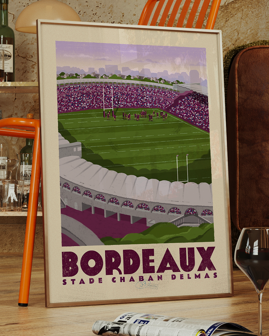 Plongez au cœur de l’ambiance mythique du Stade Chaban-Delmas à Bordeaux avec cette affiche unique, entièrement réalisée à la main par des artisans passionnés. Chaque détail a été minutieusement dessiné et peint, capturant l’architecture emblématique du stade et l’âme du rugby bordelais.
